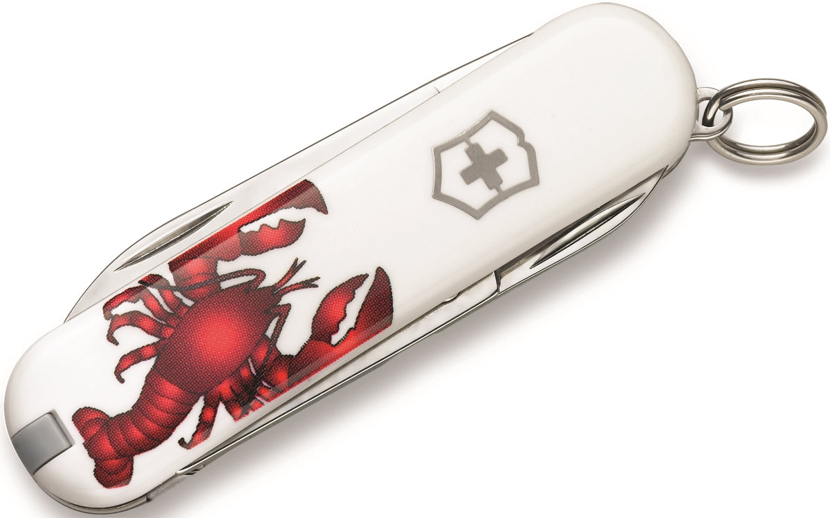 - 2 1/4" closed. All feature blade, nail file with screwdriver tip, scissors, key ring, tweezers, and toothpick. White handles with colorful lobster artwork.