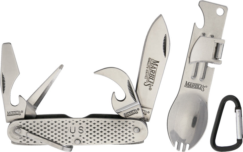 Includes G.I. Utility knife and Camper's Friend multitool. Knife is 3 5/8 closed. 440 stainless construction. 2 1/2 spear point blade, can opener, flathead screwdriver/bottle opener, leather punch, and bail. Multi-tool includes spork, mini carabiner, bottle opener, and can opener. Hang packaged.